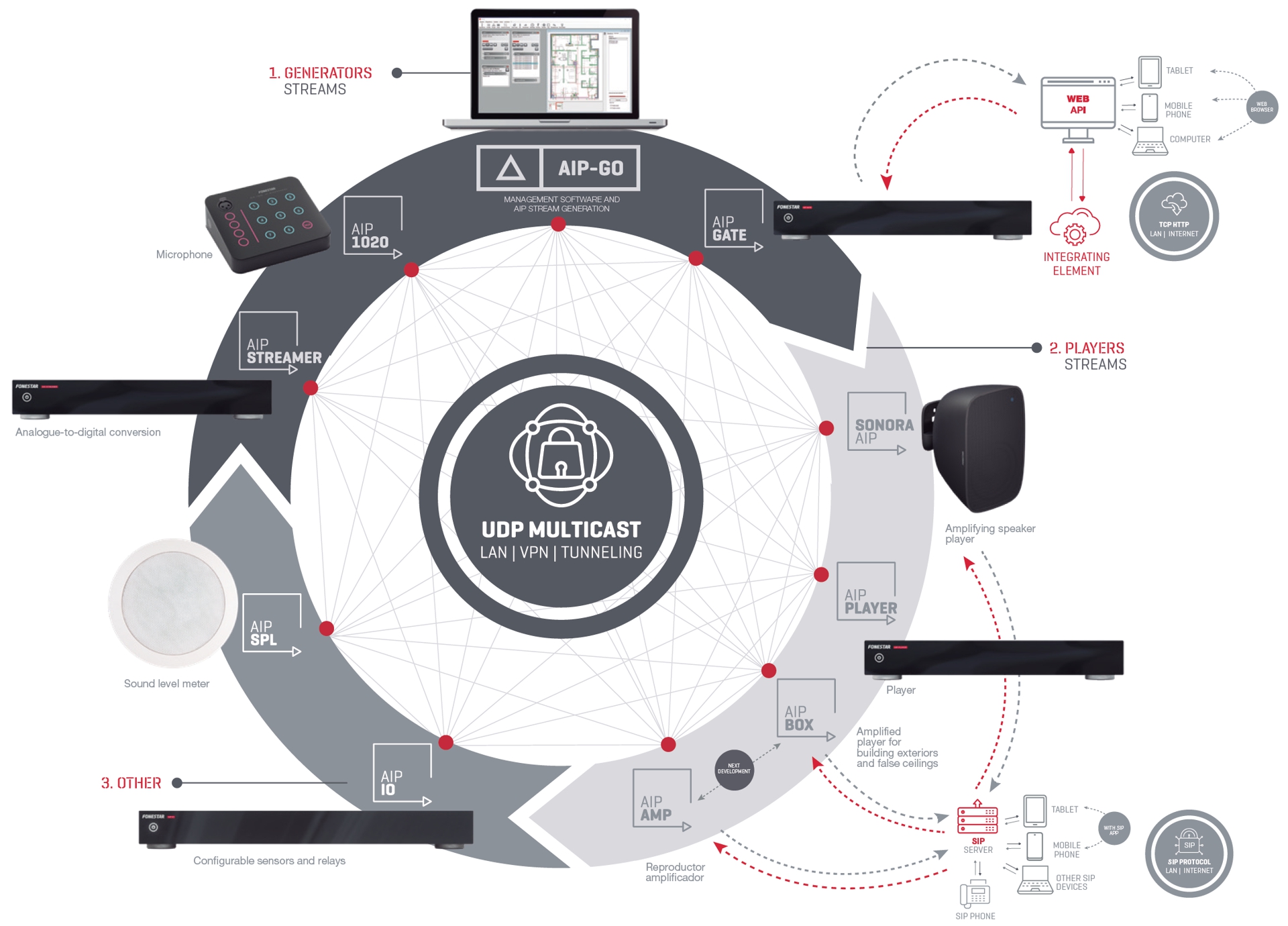 Integratie van verschillende bronnen van achtergrondmuziek en geplande berichten, evenementen, spraak- en SIP-ondersteuning. Met beheer op afstand en volledige systeembewaking.